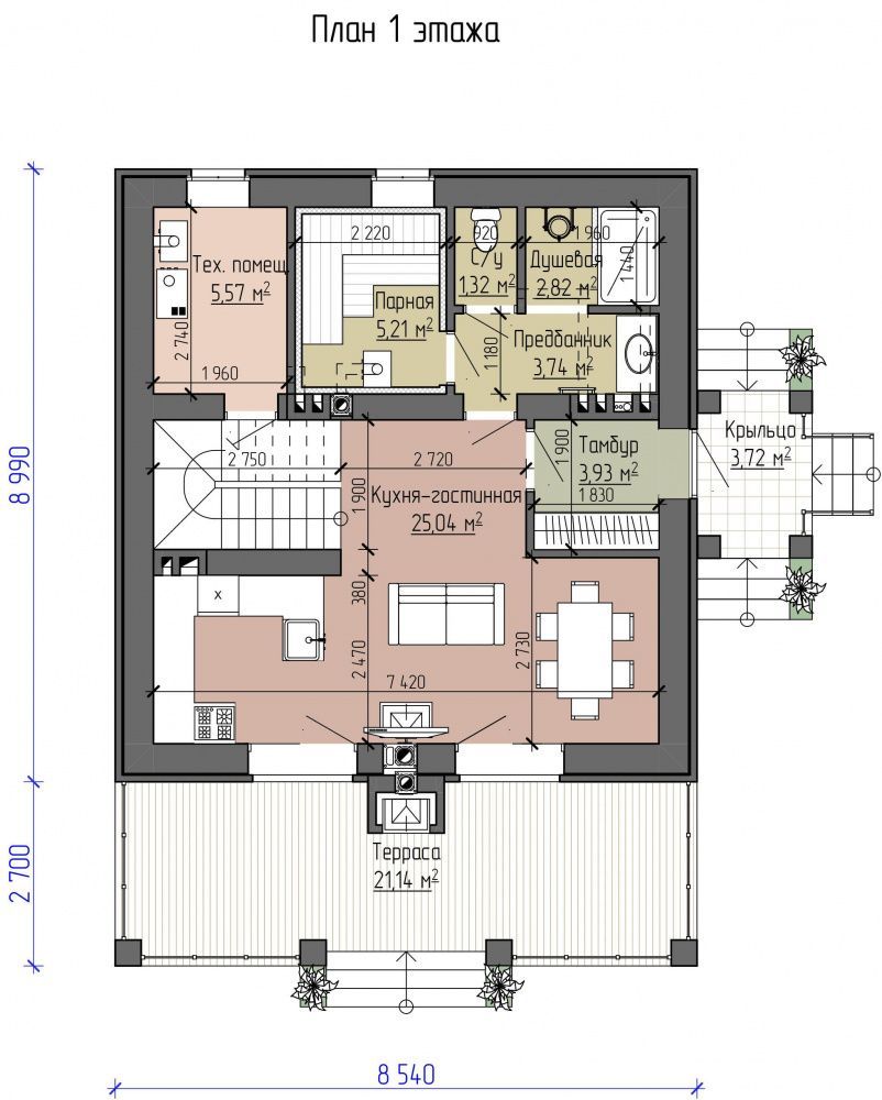 На первом этаже здания размещены: крыльцо, терраса, тамбур, техническое помещение, предбанник, душевая, парная, с/у, кухня-гостиная.
