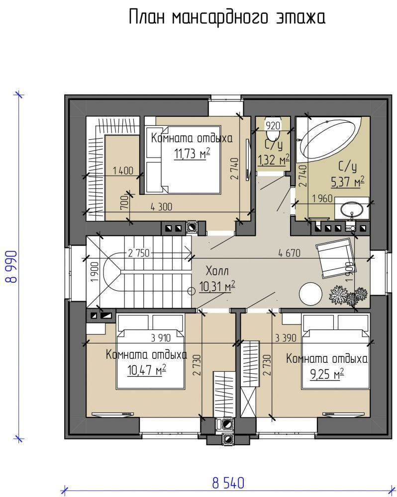 На мансардном этаже здания размещены: 3 комнаты отдыха, холл и 2 с/у.