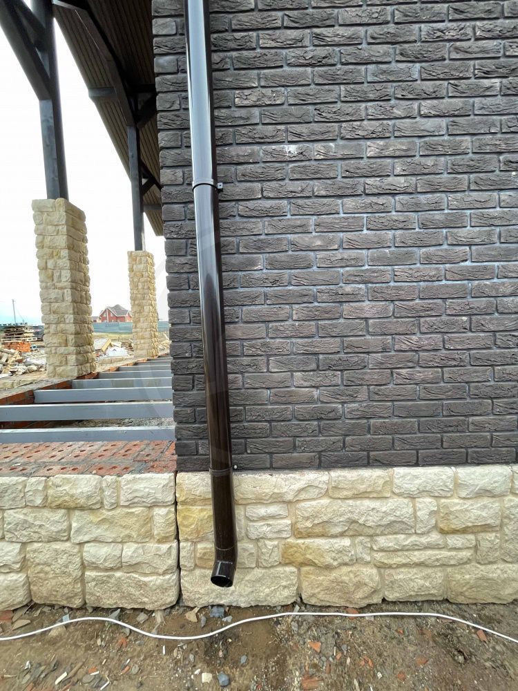 Цоколь выполнять из керамического полнотелого кирпича марки не менее М150 (размерами 250х120х65мм) с последующей наружной отделкой из искусственного камня White Hills (Данвеган 500-10).